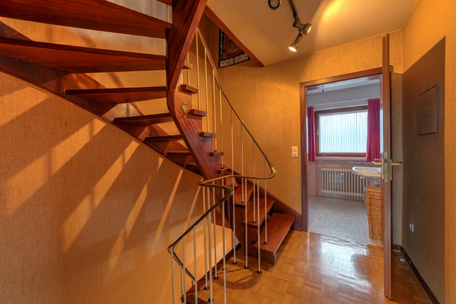 Jura-Marmor im Eingangsbereich, Fliesen, Stäbchenparkett und Teppich in weiteren Räumlichkeiten