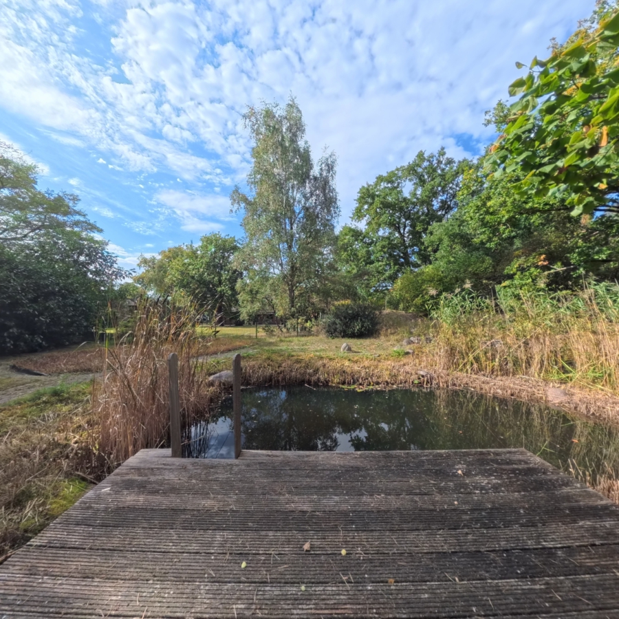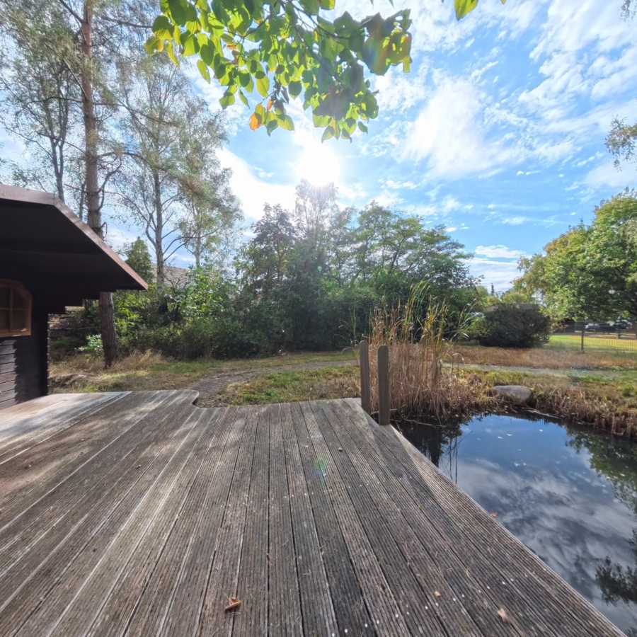 Das Highlight des Anwesens ist zweifellos das weitläufige Grundstück von 3.360 m², das viel Raum für Erholung, Hobby und individuelle Gestaltungsmöglichkeiten bietet. Im hinteren Bereich eröffnet sich ein besonderer Rückzugsort: ein kleiner Schwimmteich, an dem eine charmante Holzhütte für entspannte Stunden am Wasser sorgt. Der große Garten lässt sich vielseitig nutzen – ob als Spiel- und Liegewiese, als Platz für Gartenbau oder einfach als private Oase im Grünen.
