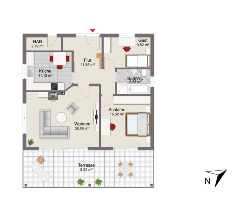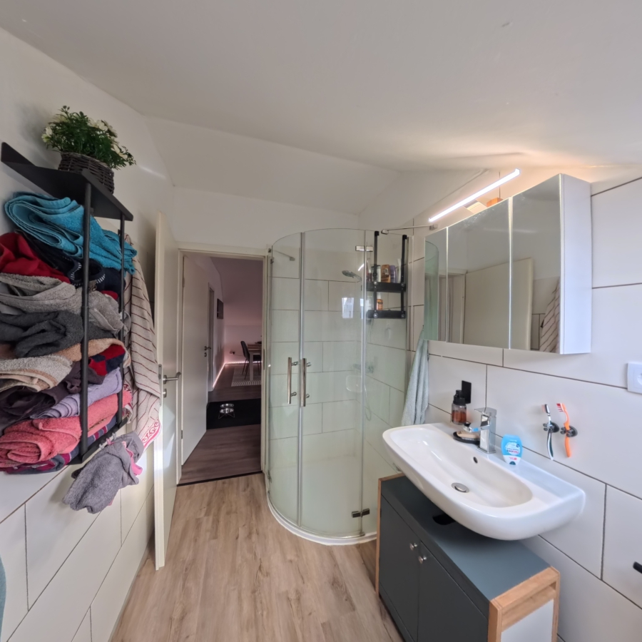 Im Erdgeschoss befindet sich eine großzügige 3-Zimmer-Wohnung mit ca. 80,85 m² Wohnfläche. Sie überzeugt durch einen praktischen Grundriss, helle Räume und eine gemütliche Atmosphäre – ideal für Paare oder kleine Familien. Hier haben Sie die Möglichkeit, selbst einzuziehen oder ebenfalls zu vermieten.