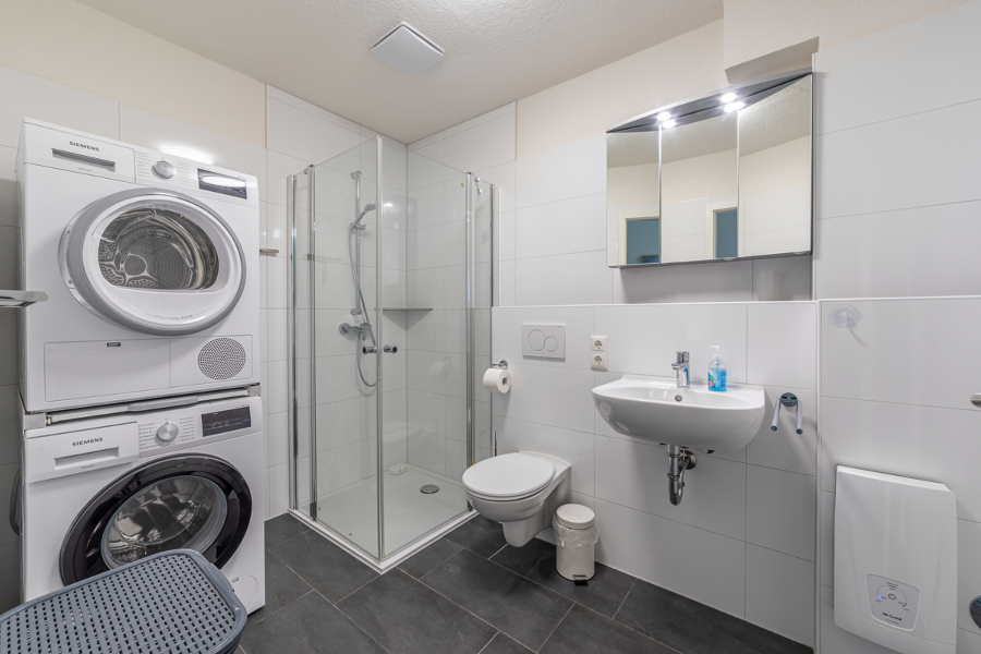 Das Badezimmer ist modern und verfügt über eine geräumige Dusche. Eine Waschmaschine und ein Trockner sind ebenfalls vorhanden.
