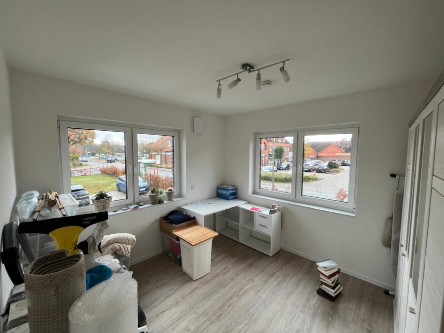 Die Wohnung umfasst einen großzügigen Flur, eine offene Wohnküche mit angrenzendem Wohnzimmer, ein Schlafzimmer sowie ein weiteres Zimmer, das sich ideal als Arbeits- oder Kinderzimmer eignet. Das moderne Bad ist mit einer bodengleichen Walk-In-Dusche ausgestattet. Ein separater Abstellraum mit Waschmaschinenanschluss bietet zusätzlichen Stauraum.
